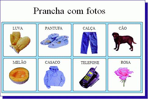Uma prancha de comunicação foi construída com fotografias e apresenta os símbolos "luva", "pantufa", "calça", "cão", "melão", "casaco", "telefone", e "rosa".