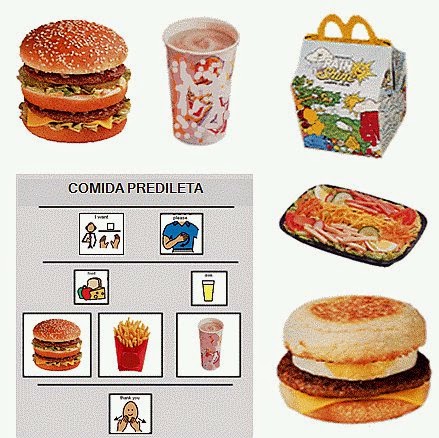 Com fotografias escaneadas de um cardápio foi montada uma prancha de comunicação temática, para comprar o lanche. Visualizamos as imagens dos sanduíches, copo de refrigerante, salada e embalagem do lanche. Estas mesmas imagens aparecem organizadas numa prancha de comunicação.
